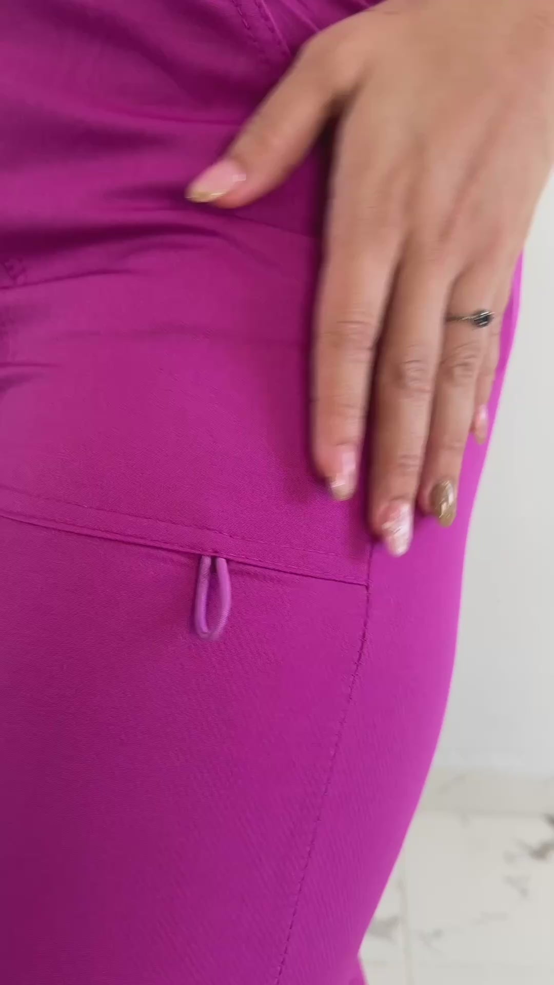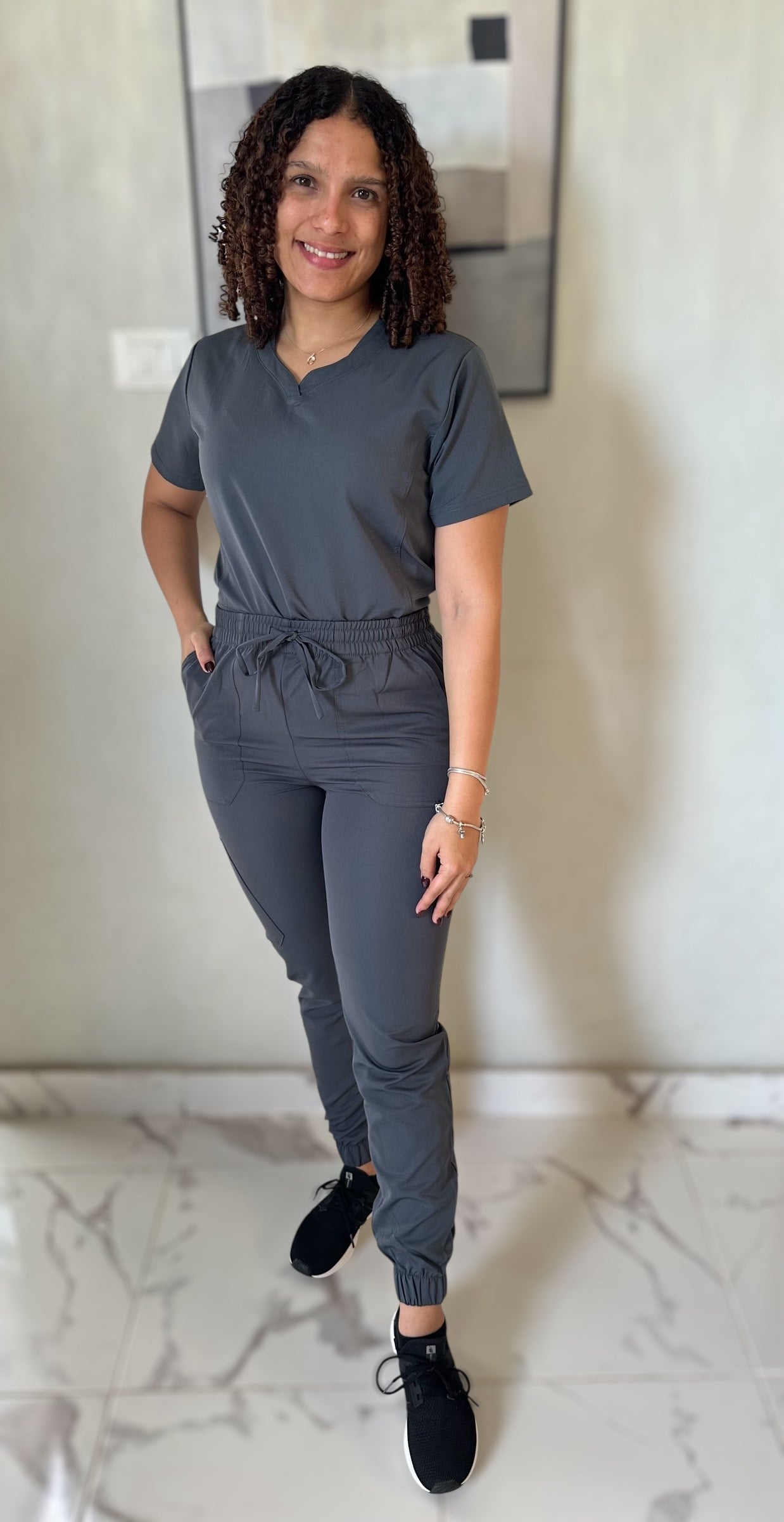 El Karisma Jogger Set 1604 combina un diseño estilizado con máxima practicidad. Su cuello tipo tulipán en V le aporta un toque femenino y diferente, ideal para profesionales que quieren verse modernas sin perder comodidad.